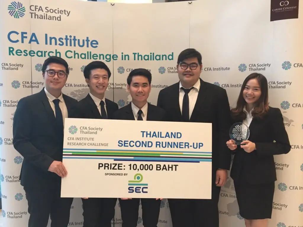 The CFA Institute Research Challenge is a competition between university-sponsored teams that research a designated publicly traded company, write a research report highlighted by a buy, sell, or hold recommendation; and then present and defend their findings to a panel of industry experts. This year, the CFA Research Challenge in Thailand